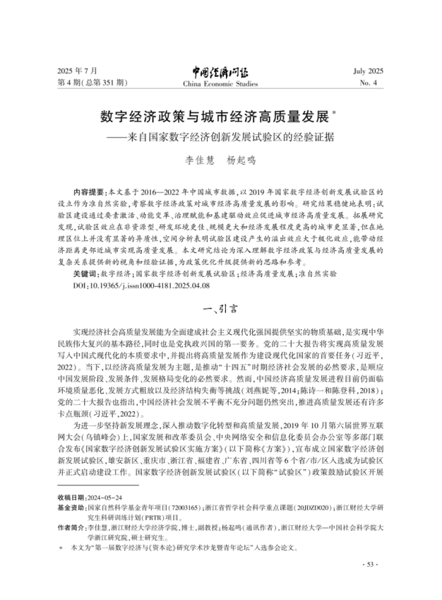 2023级西方经济学专业研究生杨起鸣同学与导师李佳慧副教授在《中国经济问题》2025年第4期发表题为《数字经济政策与城市经济高质量发展——来自国家数字经济创新发展试验区的经验证据》的封面文章。文章以国家数字经济创新发展试验区为研究对象,探讨数字经济政策在推动城市经济高质量发展中的内在机制,为理解数字化转型背景下制度变迁与发展模式变革提供了理论框架与实证支撑。